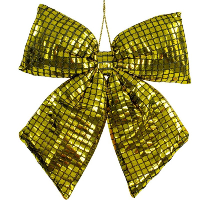 The GOLDEN DECORATIVE BOW 30x34CM MICA is an ornament that captivates not only with its elegance but also with its unique light-reflecting effect. Its gold mosaic surface creates a unique, shiny pattern, perfectly matching the atmosphere of glamour and holiday sparkle.
