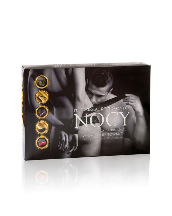 See mäng on teie pilet uude intiimsuse dimensiooni. See pole lihtsalt ajaviide, see on võimalus avastada uusi erootilisi seiklusi ja süvendada oma suhet kirgliku mängu abil. Piits, geišapallid, seotud käed ja jalad… paitused suure vürtsikusega – kõik see ootab teid selles pakendis. Kui olete alati tahtnud proovida, aga ei teadnud, kuidas alustada, või kui olete alati lootnud teievahelisele vürtsikamale seksile, siis see on see, mida otsite. Hankige Viiskümmend Naudingute Ööd ja kogege uusi emotsioone magamistoas. See on Poola kõige vürtsikam mäng, inspiratsiooniks populaarne raamat, mis räägib lummusest varjatud seksuaalsuse sfääri vastu.