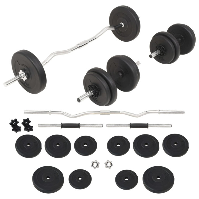 Mitmekülgne kangi ja hantlite komplekt sobib suurepäraselt rinna, biitsepsite, käsivarte, triitsepsite ja seljalihaste treenimiseks. Komplekti kuulub kaks 5 kg ketast, neli 2 kg ketast, neli 1,25 kg ketast, üks kang ja kaks hantlivart ning selle kogukaal on umbes 30 kg.