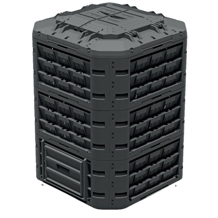 The COMPOGREEN VARIO 950L GARDEN COMPOST BIN is a large, modular container that allows for quick and convenient composting of organic waste without the need for tools. Thanks to the lockable lid, bottom sliders for easy compost removal, and a ventilation system, the process is efficient, hygienic, and odor-free.