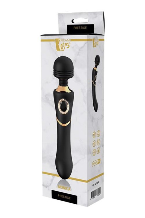 Stymulator różdżki Monica z kolekcji Prestige od Dream Toys to czarna różdżka ze stylowymi złotymi akcentami, guzikiem w kształcie klejnotu, mocnym, solidnym uchwytem, ??zaokrągloną główką i elastyczną szyjką. Monica ma mocny silnik, który oferuje 7 wzorów wibracji i 3 prędkości. Wibrator Monica Wand można ładować za pomocą dołączonego magnetycznego kabla USB. Wykonany jest z miękkiego silikonu i ABS, wodoodporny i bezpieczny dla ciała, nie zawiera ftalanów ani lateksu. Operację można wykonać jednym dotknięciem przycisku w kształcie klejnotu, który po aktywacji świeci niebieskim światłem LED.