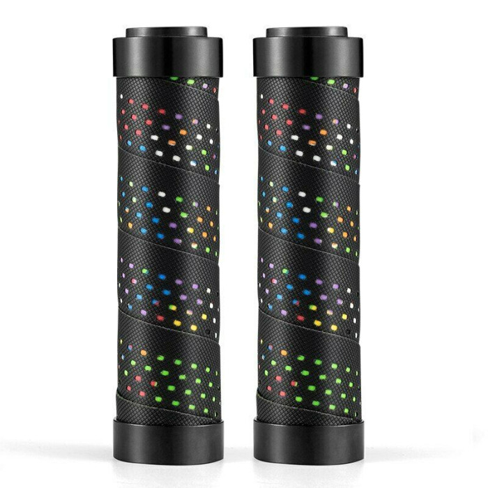 Handlebar grips made of elastomeric rubber for a unique soft feel while maintaining durability. The unique grip surface pattern provides shock absorption and improved ventilation. Equipped with aluminum buckles. Grip plugs included.
