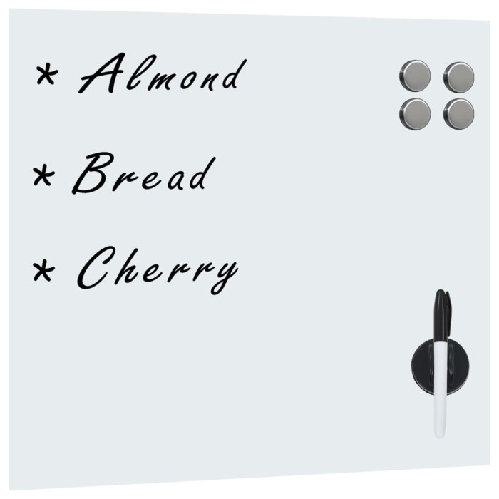 Klaastahvel on valmistatud karastatud turvaklaasist, mida pole lihtne määrida, kriimustada ega mõlkida. Tahvlile saab komplekti kuuluvate magnetitega pabereid ja märkmeid kinnitada. Lisaks saate komplekti kuuluva kuivkustutatava valge viltpliiatsiga asju kirjutada ja kustutajaga kustutada. Komplekti kuuluvad seinakinnitused, et saaksite tahvli oma kodu, kontori või kooli seinale kinnitada.