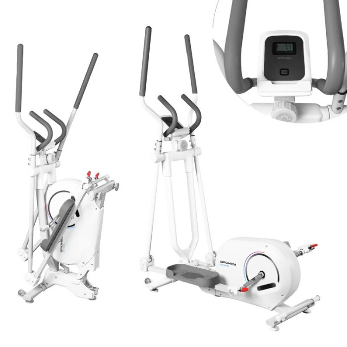 CRYSTAL – Elliptical Trainer for a Full-Body Workout. The Spokey CRYSTAL is a foldable elliptical trainer that allows you to engage your entire body during a home cardio workout – without straining your joints. Equipped with a reverse motion, heart rate monitor, 8-level magnetic resistance, and an LCD display, it offers functionality, convenience, and space-saving design all in one. Looking for a device that will help you get fit without leaving home? The Spokey CRYSTAL elliptical trainer is the perfect choice for those who want to combine an effective full-body workout with comfort and space-saving functionality. Thanks to its magnetic resistance, quiet operation, and foldable design, the CRYSTAL trainer works well even in small spaces. The device engages key muscle groups without putting strain on joints – making it perfect for both beginners and advanced users. Why is it worth trying the Spokey ZEN exercise bike? Full-body workout without joint strain. The elliptical motion engages the muscles of the legs, arms, back, and abdomen, while protecting joints from excessive stress – an ideal choice for people of all ages. Reverse motion for exercise variety. The ability to move backwards allows you to activate additional muscle groups and enrich your daily workout. 8-level magnetic resistance. Manual resistance adjustment allows you to adjust the intensity level of your workout to your individual needs – from a warm-up to an intense cardio workout. Pulse measurement and training data. Built-in heart rate sensors and an LCD screen help you monitor your fitness and progress: time, speed, distance, calories burned, and total mileage (ODO). Foldable with transport wheels. After finishing your workout, the trainer can be easily folded and stored in a convenient place. Tablet or smartphone holder. The holder allows you to conveniently use multimedia or fitness apps while exercising. Detailed description: The Spokey CRYSTAL elliptical trainer is a universal elliptical trainer that combines training effectiveness with complete comfort of use. Thanks to the 4-kilogram flywheel with bidirectional movement, exercises are smooth and more varied. Additionally, the 8-level adjustable magnetic resistance makes the equipment suitable for both beginners and advanced users. The ergonomic design with a 31 cm stride length ensures natural and comfortable movement for every user. A major advantage of the equipment is its folding function – when folded, the trainer takes up significantly less space, making it easier to store. Technical data Type: elliptical trainer Resistance type: magnetic, manual Number of resistance levels: 8 Flywheel weight: 4 kg (bidirectional) Display functions: time, speed, distance, calories, pulse, total mileage (ODO), scan Stride length: 31 cm Pulse measurement: yes (sensors in the handles) Dimensions: 121 × 61.5 × 157.5 cm Dimensions after folding: 54.5 × 61.5 × 158 cm Folding: yes Crank: high-quality 3-piece Tablet/smartphone holder: yes Transport wheels: yes Device weight: 33 kg Maximum user weight: 130 kg Certificates, standards and warnings Compliance with EU safety standards. The product is intended for home use only. The device is not intended for children. Use and Care: Train in a well-ventilated room on a flat surface. Wear athletic shoes with good grip. Wipe the handles and console with a dry cloth after each workout. Regularly check the equipment's mounting and stability. Do not use the trainer outdoors or in a damp environment. Fold and store it upright in a dry place. Read the instruction manual before first use. Avoid contact with water and store the equipment in a dry place. Unplug the power cord when not in use for an extended period. Frequently Asked Questions: Is the CRYSTAL trainer suitable for beginners? Yes, the 8-level magnetic resistance allows you to start with light exercises and gradually increase the intensity. Can you walk backwards on the CRYSTAL? Yes – the bidirectional flywheel movement also allows for reverse training. What data does the LCD screen display? The display provides information on training time, speed, distance traveled, calories burned, heart rate, and total mileage (ODO). Is the device quiet? Yes – magnetic resistance ensures very quiet operation, so you can exercise even in the evening without worrying about disturbing your family. What body parts are worked during a workout on the CRYSTAL? The elliptical trainer simultaneously engages the lower and upper body – the muscles of the legs, glutes, abdominals, back, and arms. It's an effective cardio workout that strengthens the entire body with minimal stress on the joints. Safety information: WARNING! If you experience pain or pressure in your chest, irregular heartbeat, shortness of breath, feel faint, or experience discomfort during exercise, STOP TRAINING IMMEDIATELY! Consult a physician before continuing. This device is not intended for individuals (