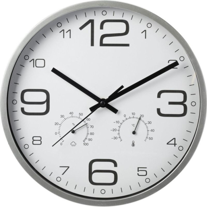 The 30CM WALL CLOCK WITH THERMOMETER, WHITE, is a modern clock with a clear display of time, temperature, and humidity. Its simple, minimalist design is perfect for offices, modern interiors, and even workspaces.